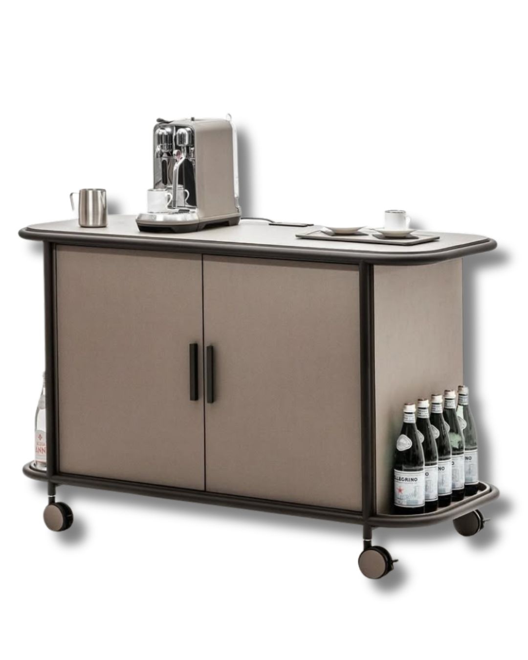 Luxury bar cart with storage, drawers, and integrated fridge for refined interiors