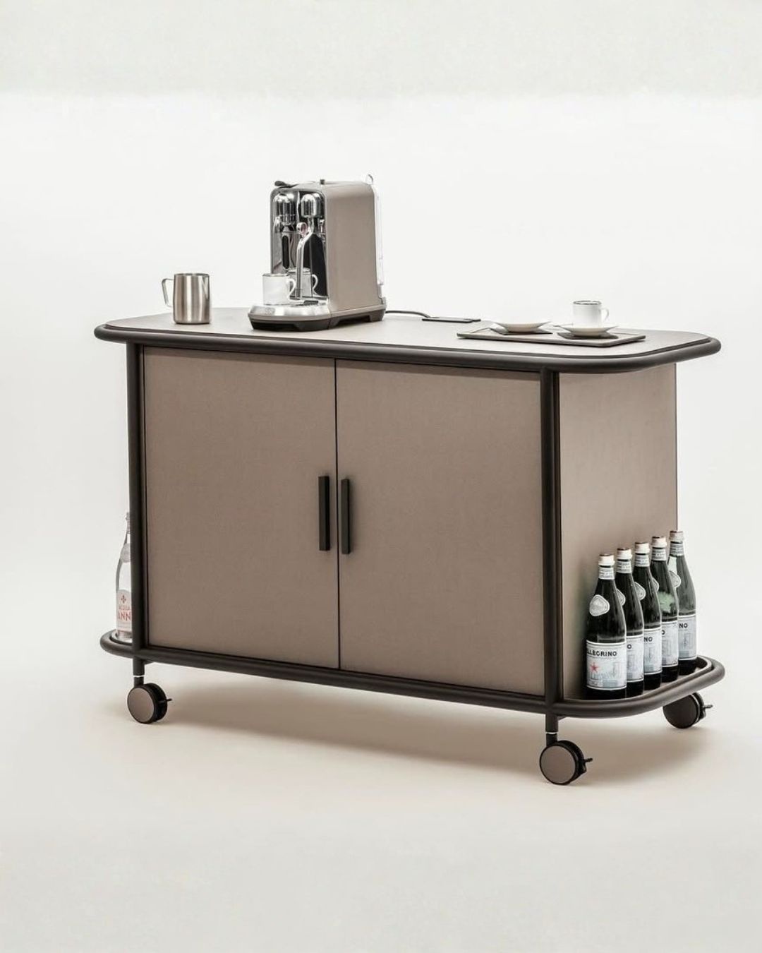The Arcade bar cart, available at Segraeti Monte-Carlo, is a sophisticated piece designed as a complete mobile hospitality unit.