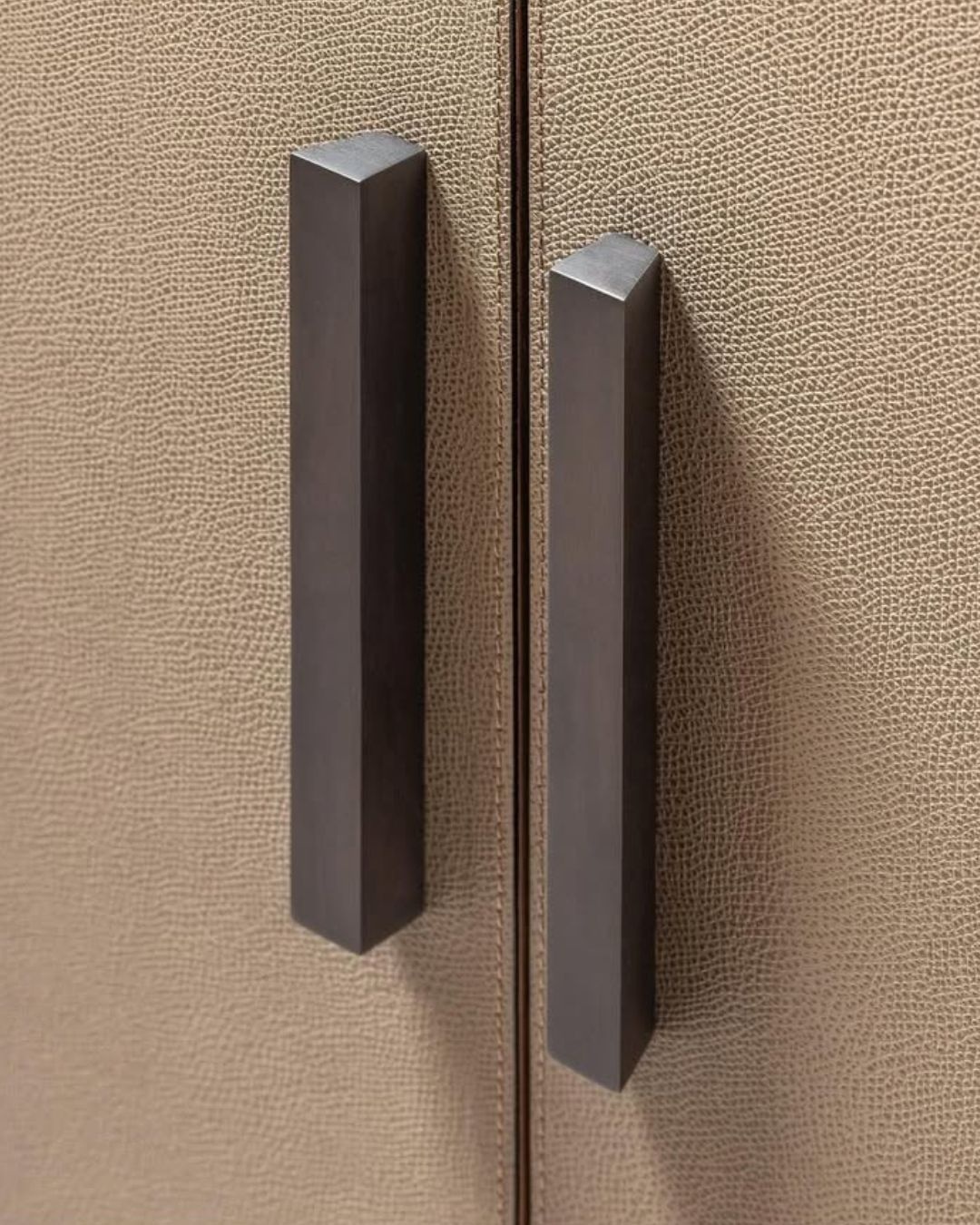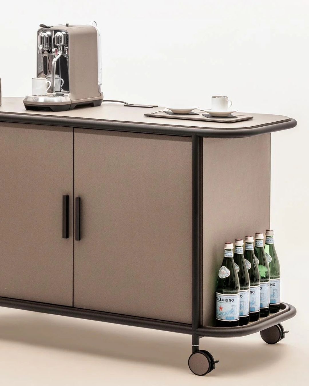 Its leather-covered wooden structure in Golf Mud finish, combined with a bronze metal frame on wheels, creates a perfect balance between refinement and functionality.