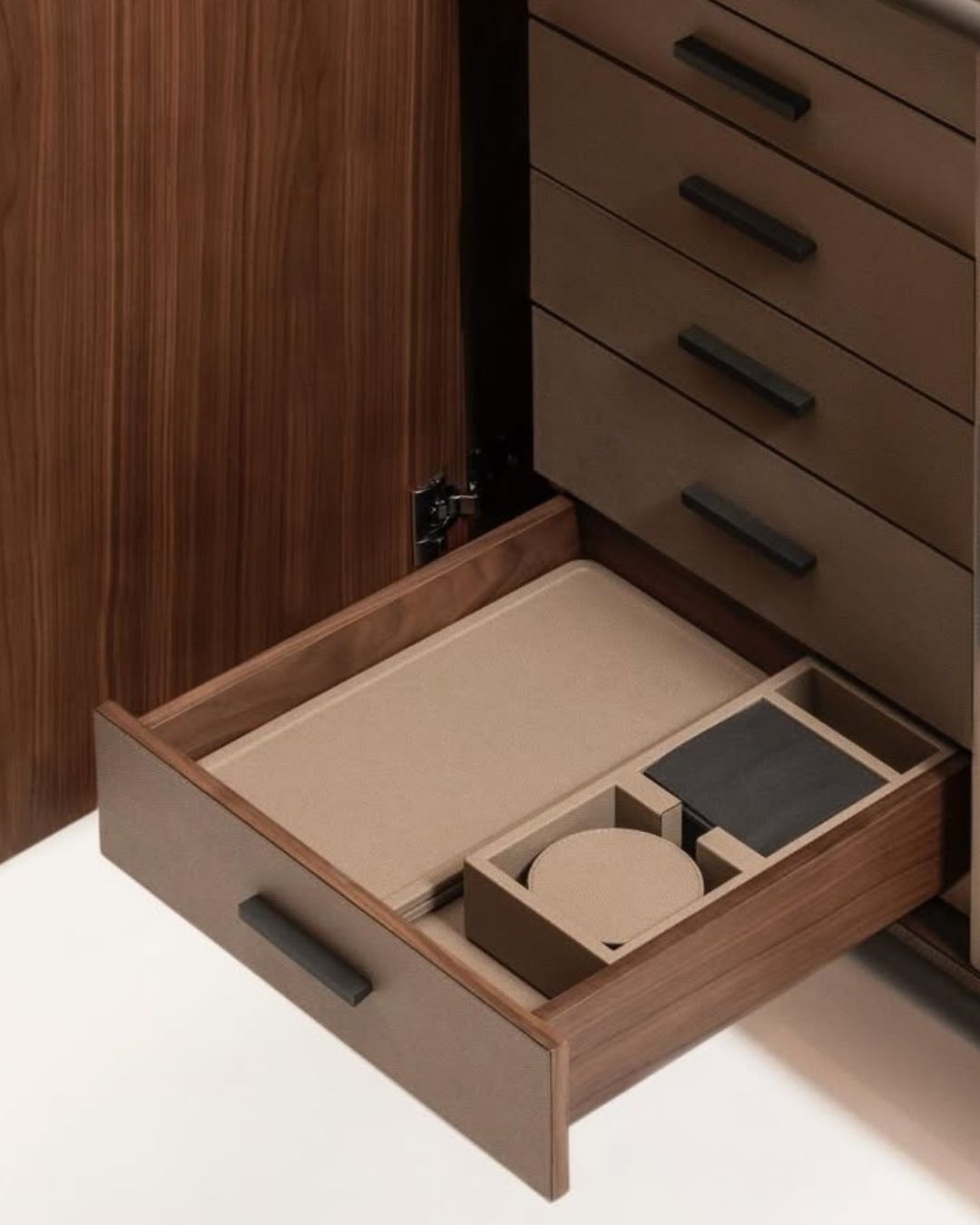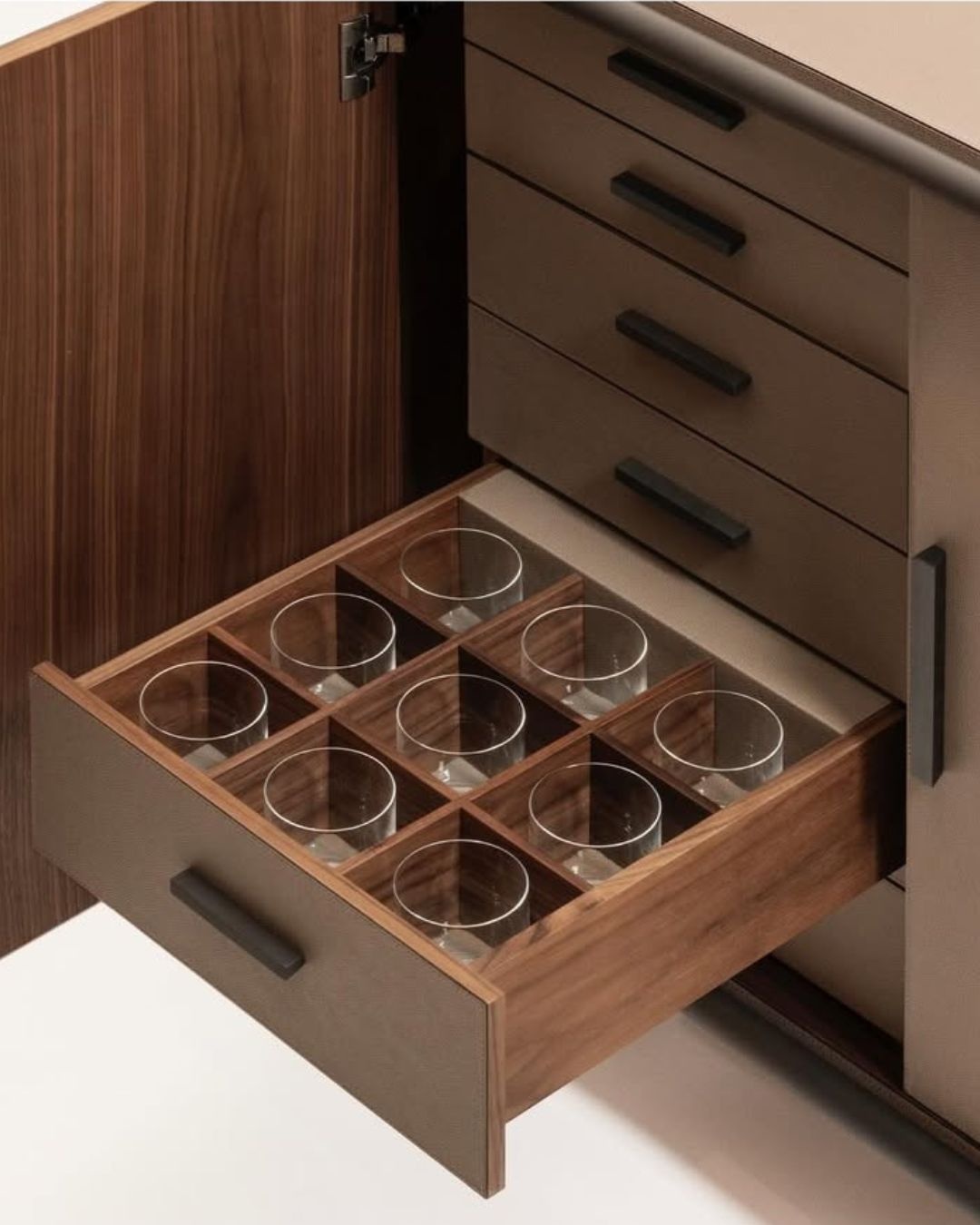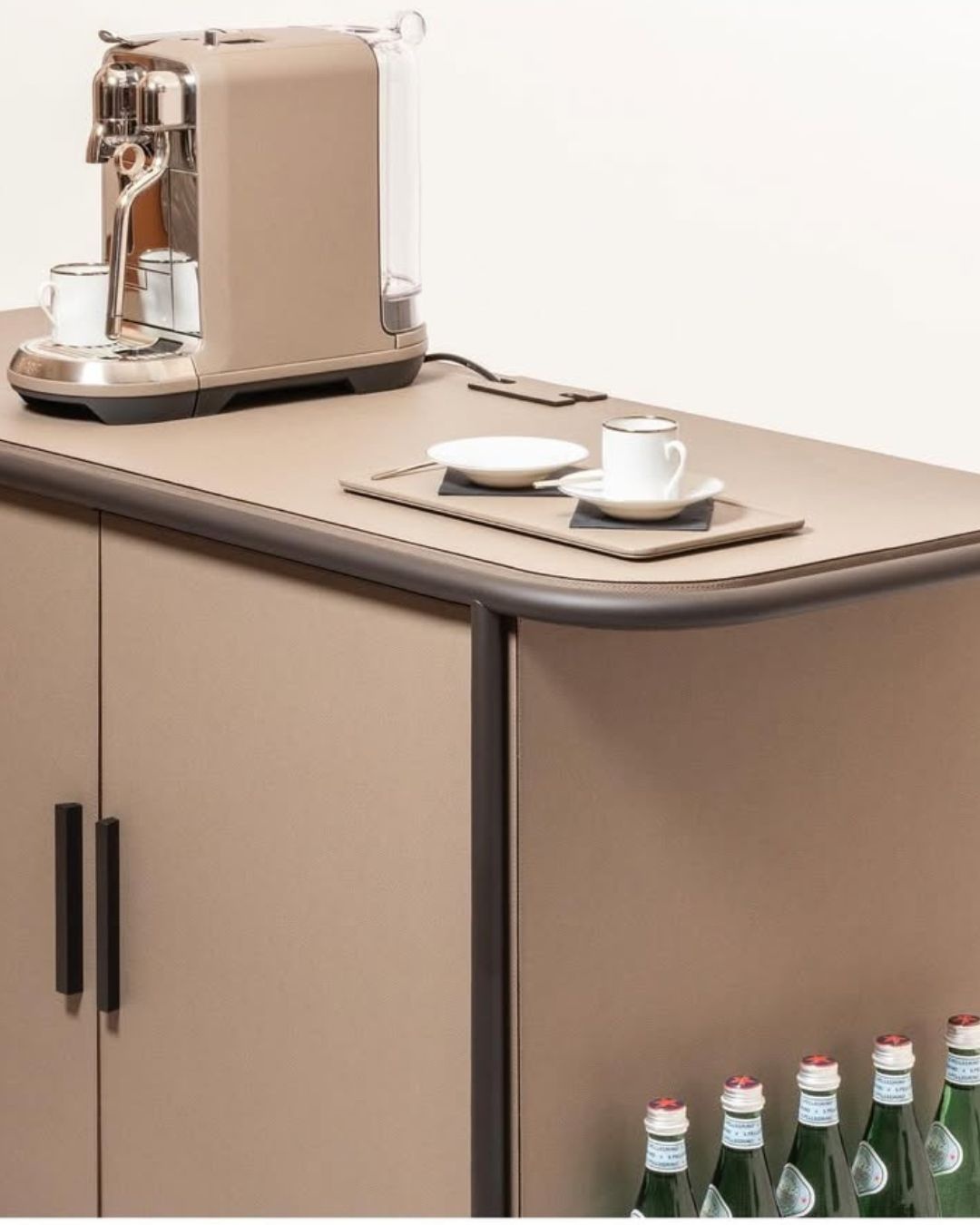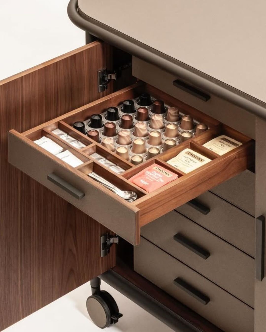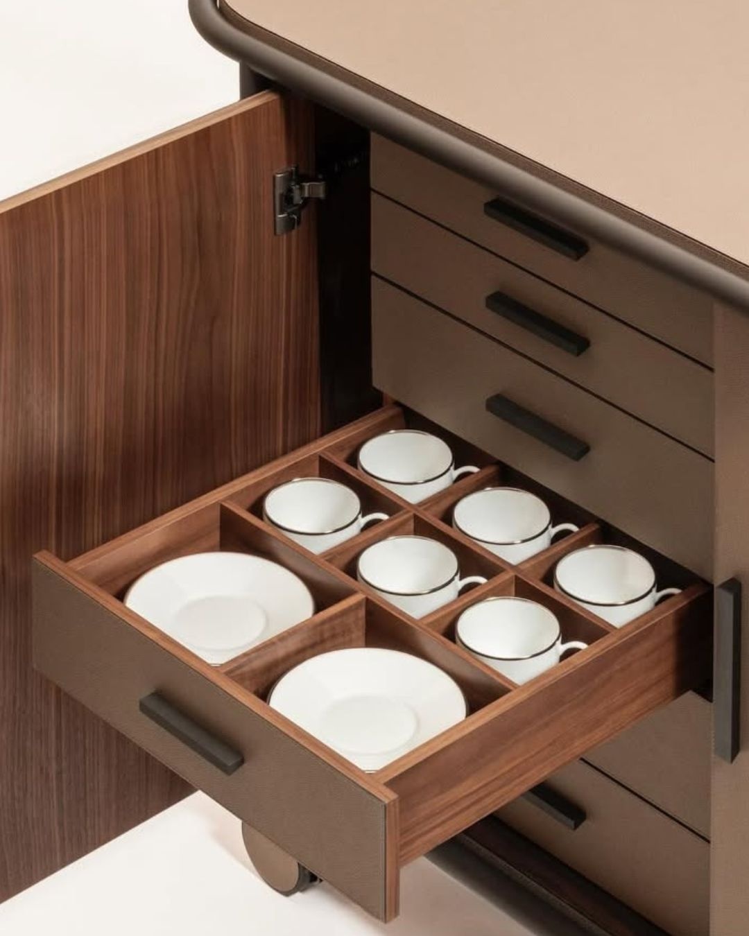 Its modular interior allows full customization depending on service requirements. The six-drawer configuration provides organized storage for service accessories and refined tableware. A discreet rear compartment ensures access to power while maintaining a clean design. With its refined lines and premium materials, it becomes a true functional statement piece.