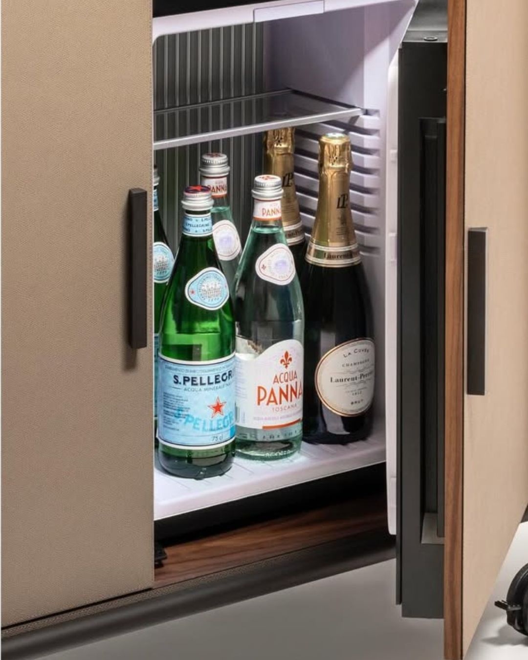 It integrates storage, organization, and refrigeration into a single elegant object.
