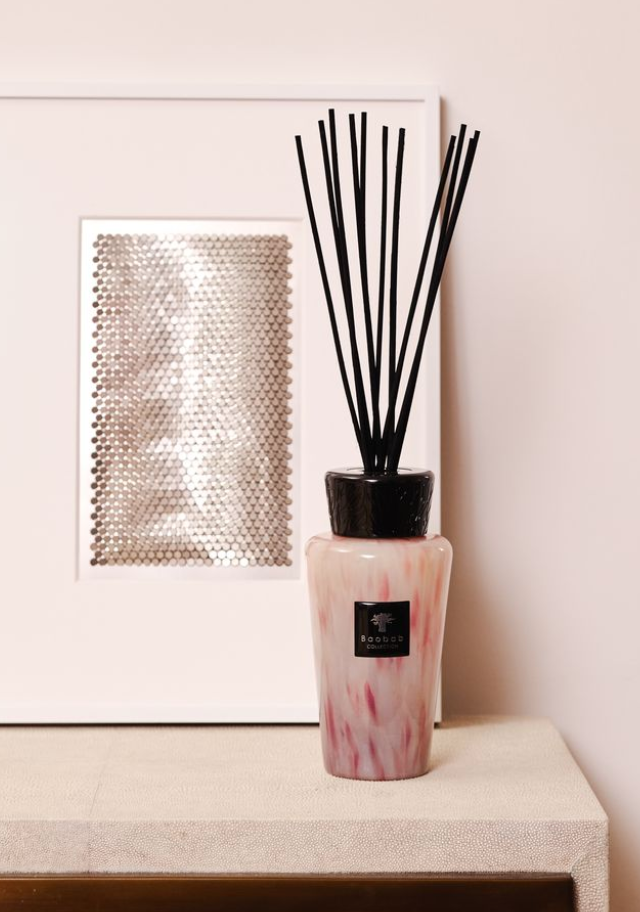 A perfume diffuser by sticks in a mouth-blown glass bottle by master glassmakers. Its fragrance will transport you to a delicate universe of white musk and jasmine with refined elegance.