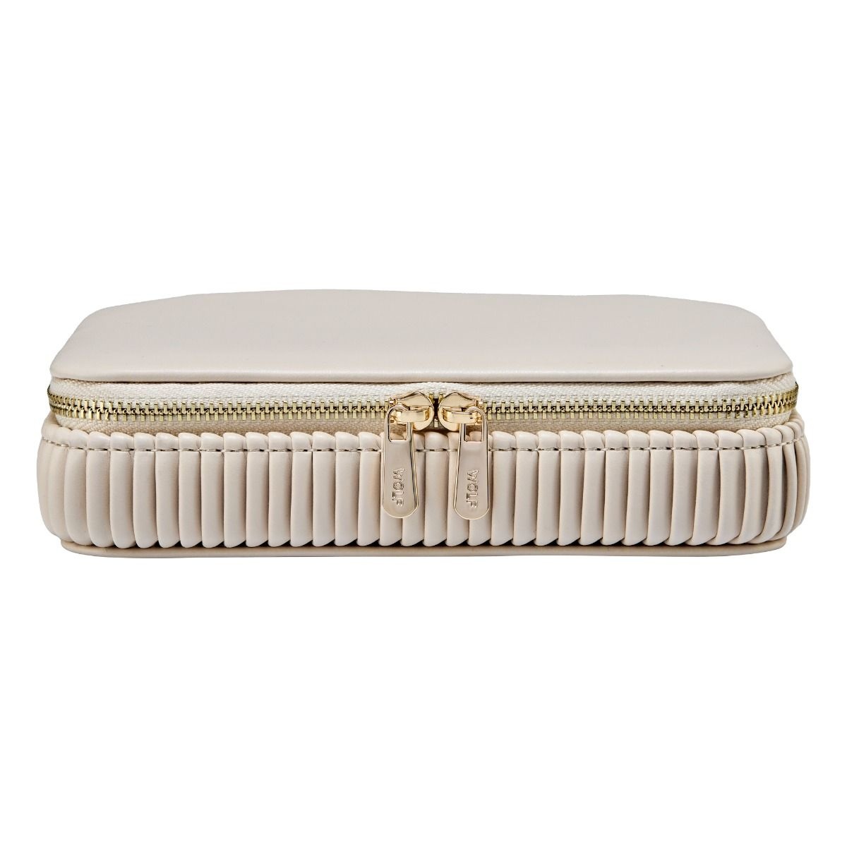 The Bella Zip Case Bone, available at Segraeti Monte-Carlo, is the perfect companion for stylish and practical jewellery storage. With its smooth vegan exterior, beautifully pleated sides and gold-tone hardware, this compact case blends elegance with utility.