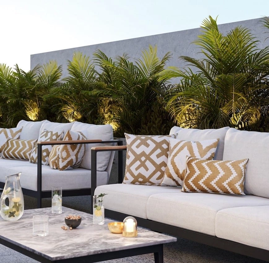 The Dadra outdoor cushion 50x50 cm, available at Segraeti Monte-Carlo, offers a soft and natural aesthetic. Featuring a hand-printed pattern in beige and off-white tones, it brings timeless elegance to outdoor spaces, perfect for a warm and refined atmosphere.