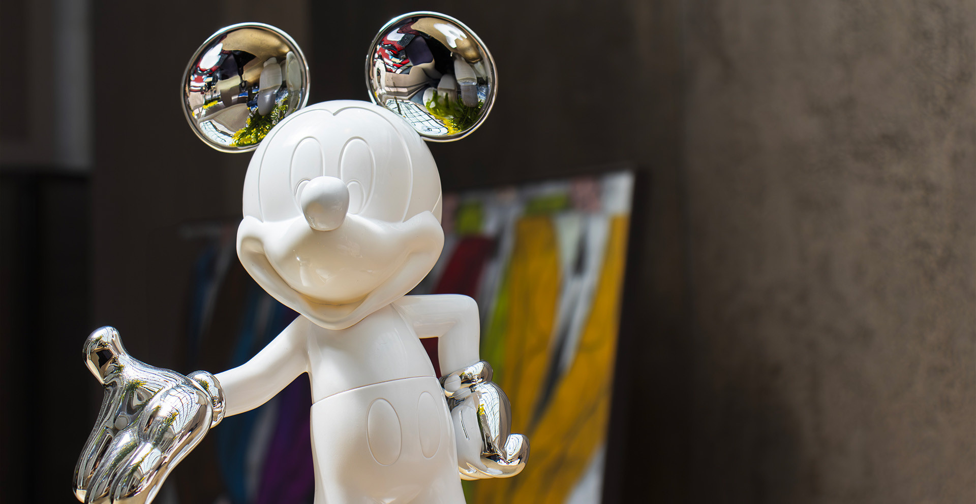 Mickey Welcome Bicolore Small 30 cm sculpture, Open Edition. Contemporary reinterpretation of Mickey Mouse with matte finish and chromed details in ABS. An iconic pop art decorative object.