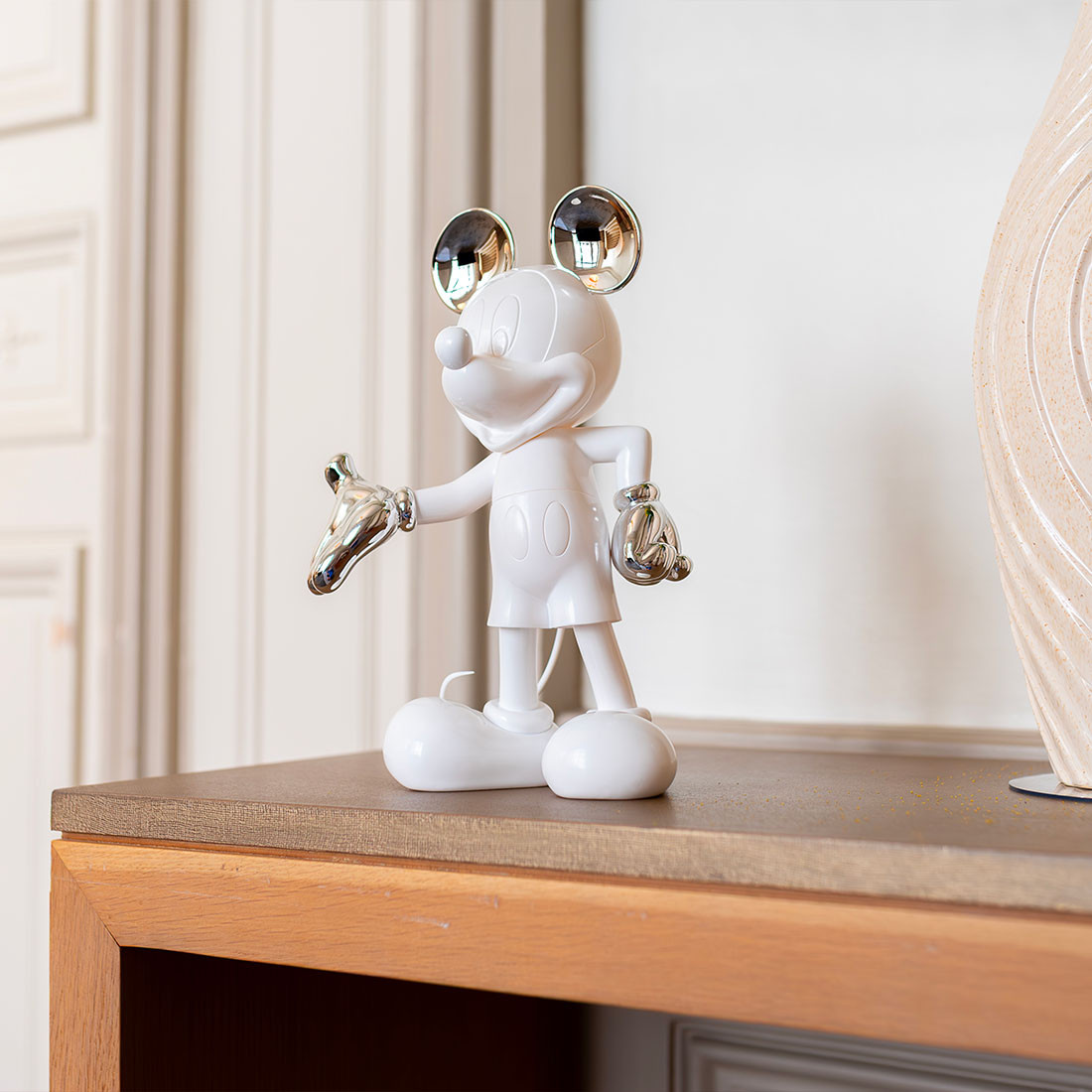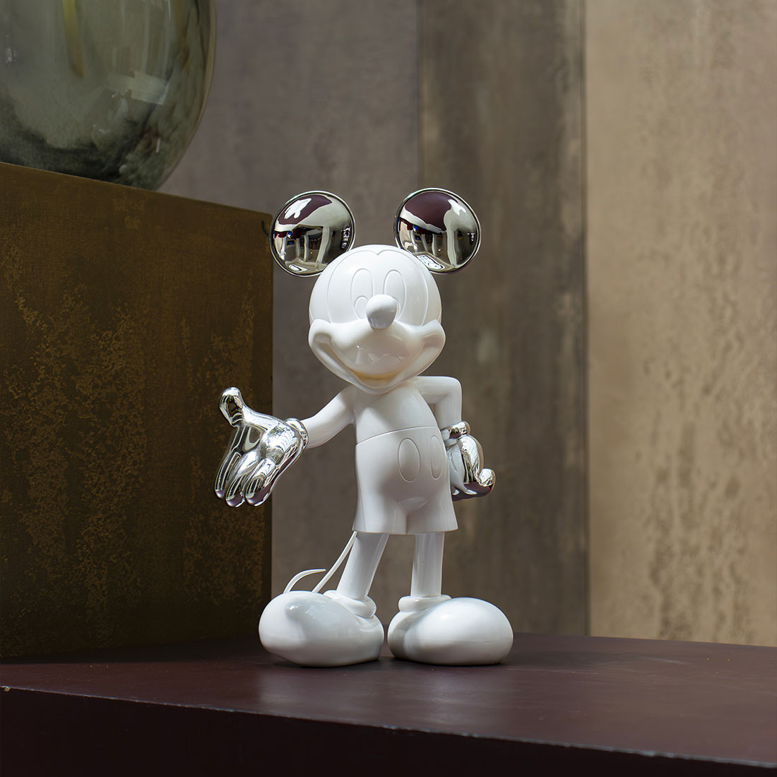 As the most famous anthropomorphic mouse in the world, Mickey Mouse has been a universal pop culture icon since 1928. This bicolour version highlights his iconic silhouette through a refined contrast of matte and chromed finishes, creating a modern and sculptural decorative piece.