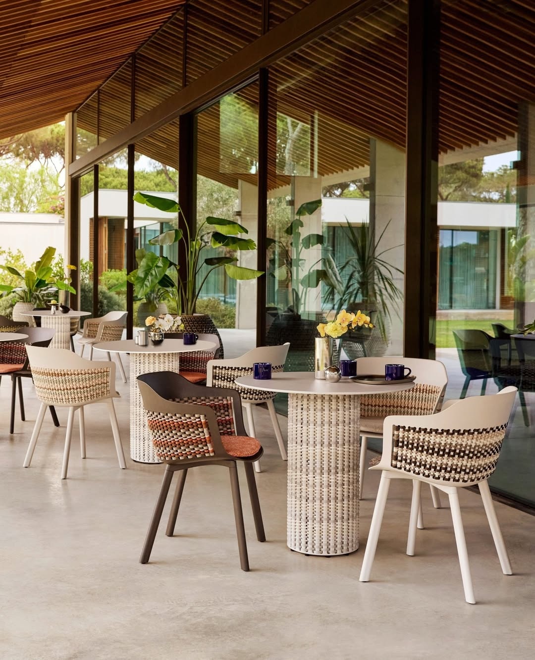 MYMI round bistro table by DEDON in Monaco at Segraeti Monte-Carlo. Luxury outdoor design in synthetic fibre with polypropylene top, durable and elegant for high-end terraces and gardens.