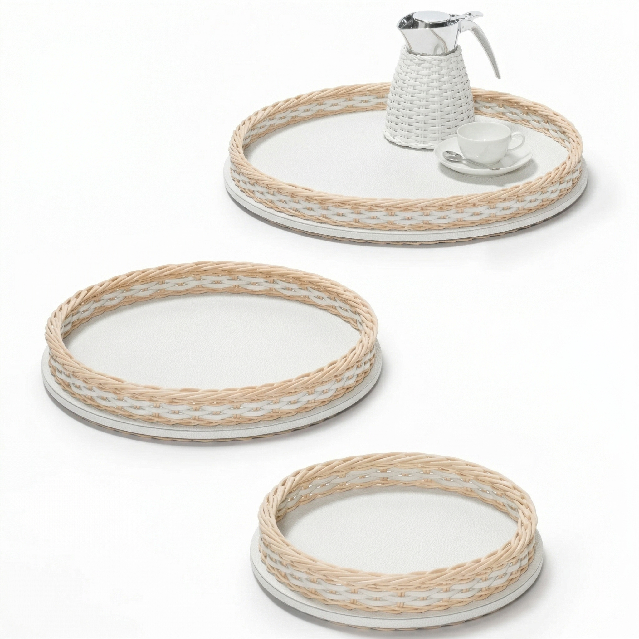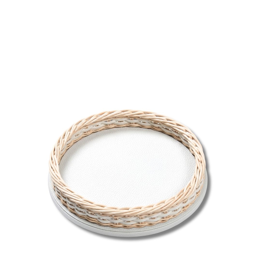 Round tray in natural rattan and Golf White leather for elegant serving and refined décor