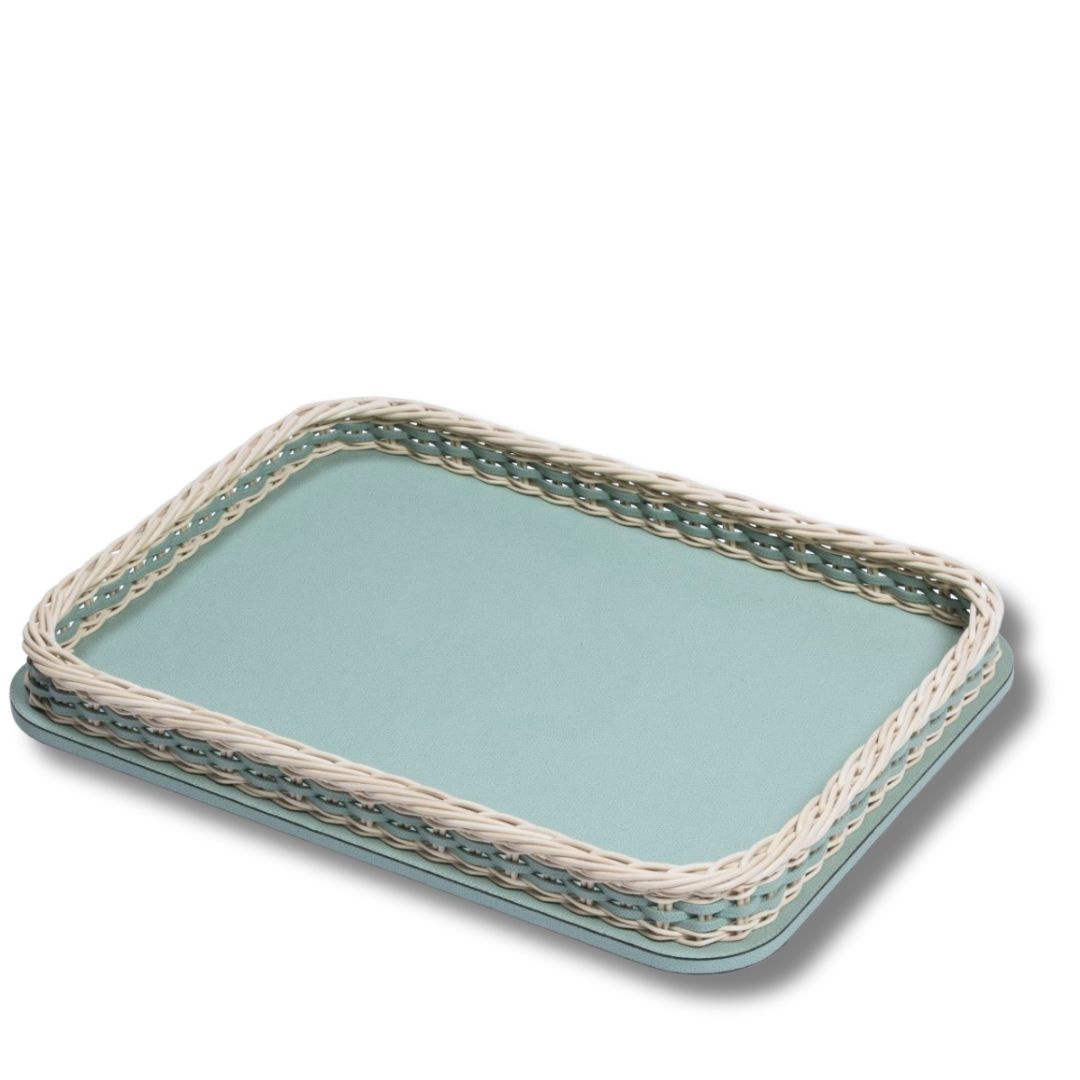 Orsay rectangular tray Giobagnara in Monaco at Segraeti Monte-Carlo. Luxury tray in Golf Sky leather and rattan.