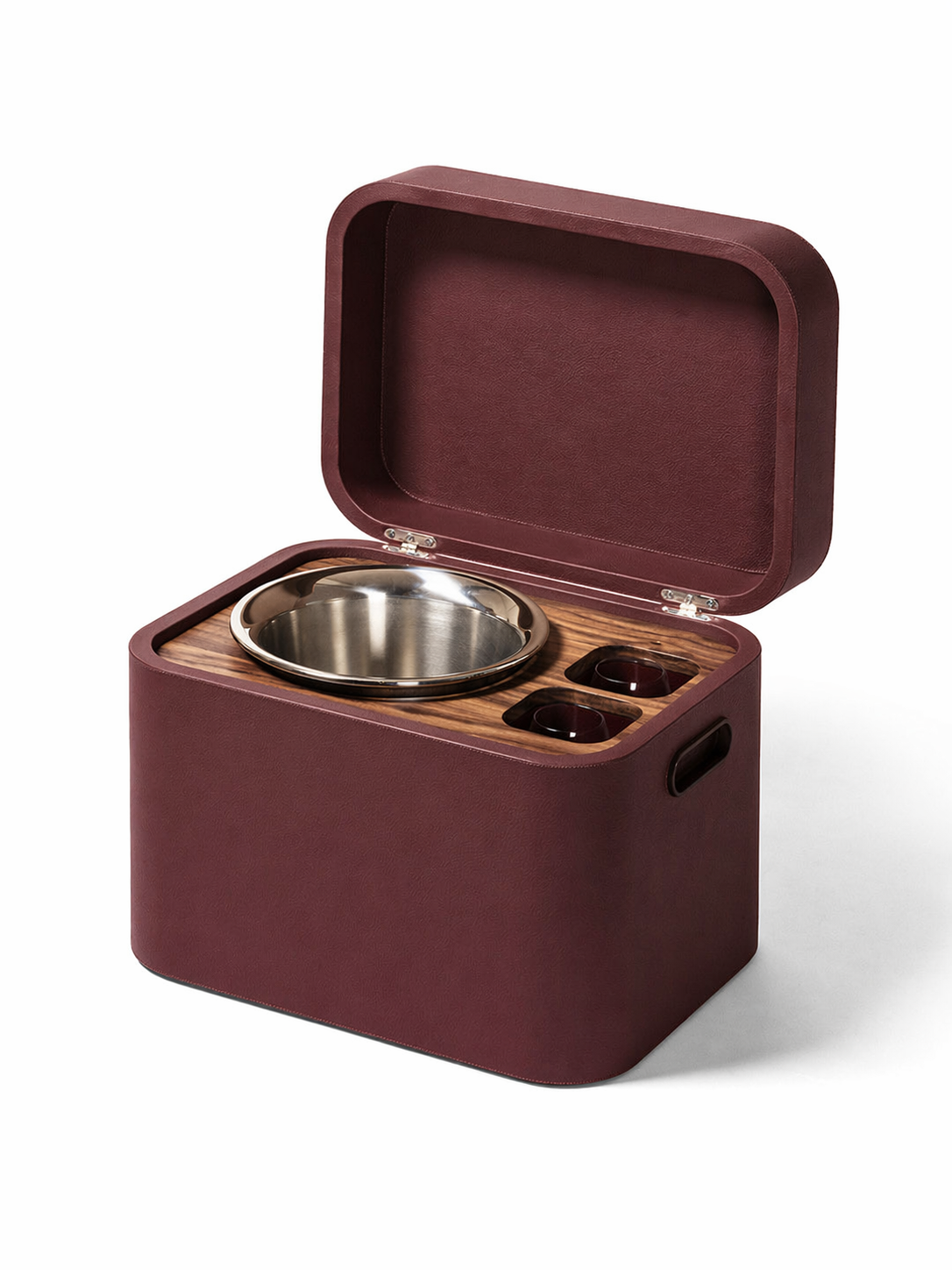 The Poltrona Frau champagne box, available at Segraeti Monaco, is part of the Beautilities collection, designed to elevate everyday experiences through refined design. Created in collaboration with Giobagnara, this piece combines functionality with exceptional craftsmanship. Fully upholstered in Pelle Frau® leather in Brossura finish, it features a rich burgundy tone and elegant detailing.