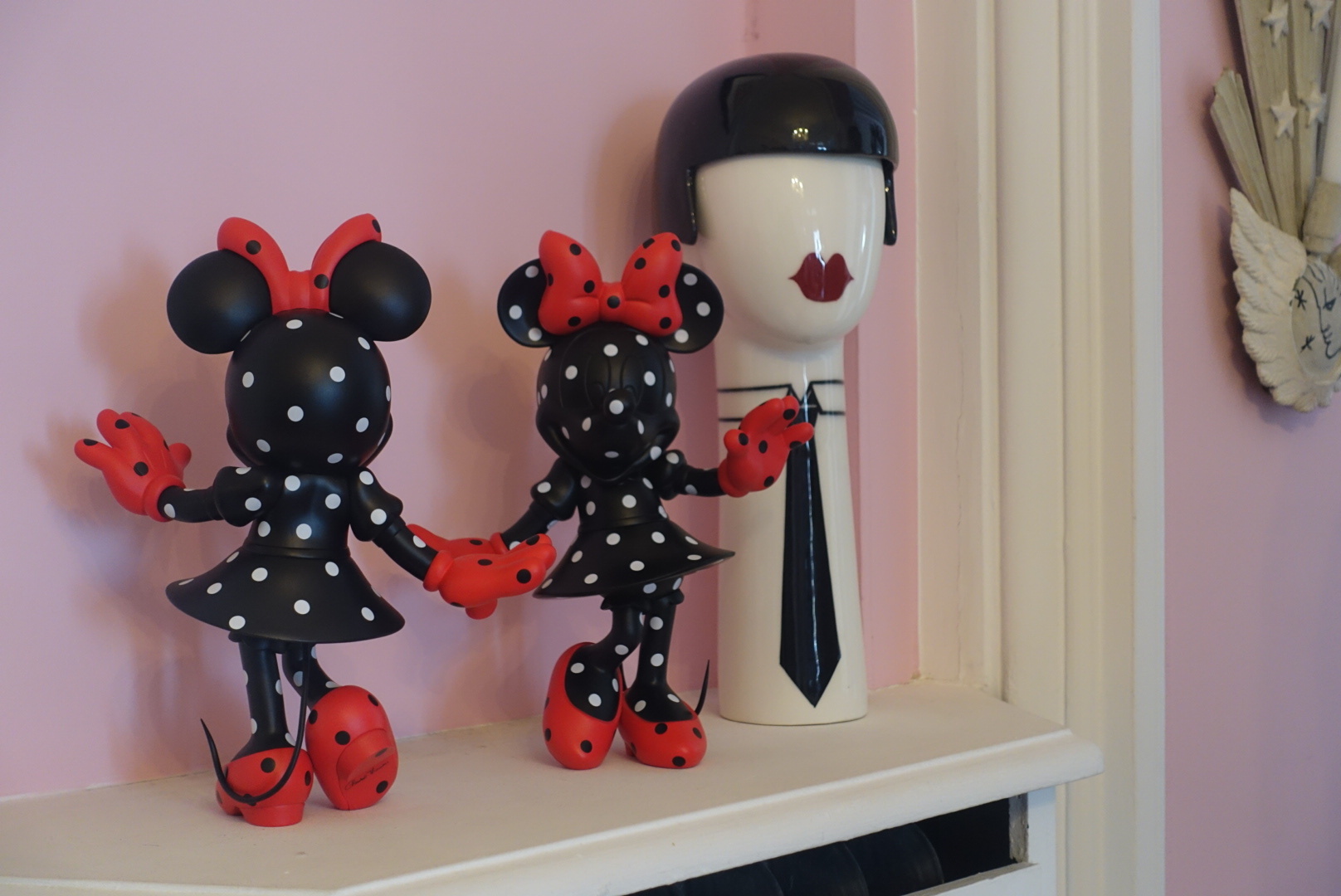 « Leblon Delienne et Disney m’ont invitée à exprimer ma vision ; comme elle, j’aime les pois, alors je l’ai plongée dans un bain de confettis noirs, blancs, rouges… Mais un rouge mat comme mon rouge à lèvres ! » «… Des confettis comme ses grains de beauté, dont les précieuses usaient et abusaient comme autant de messages de séduction ! »