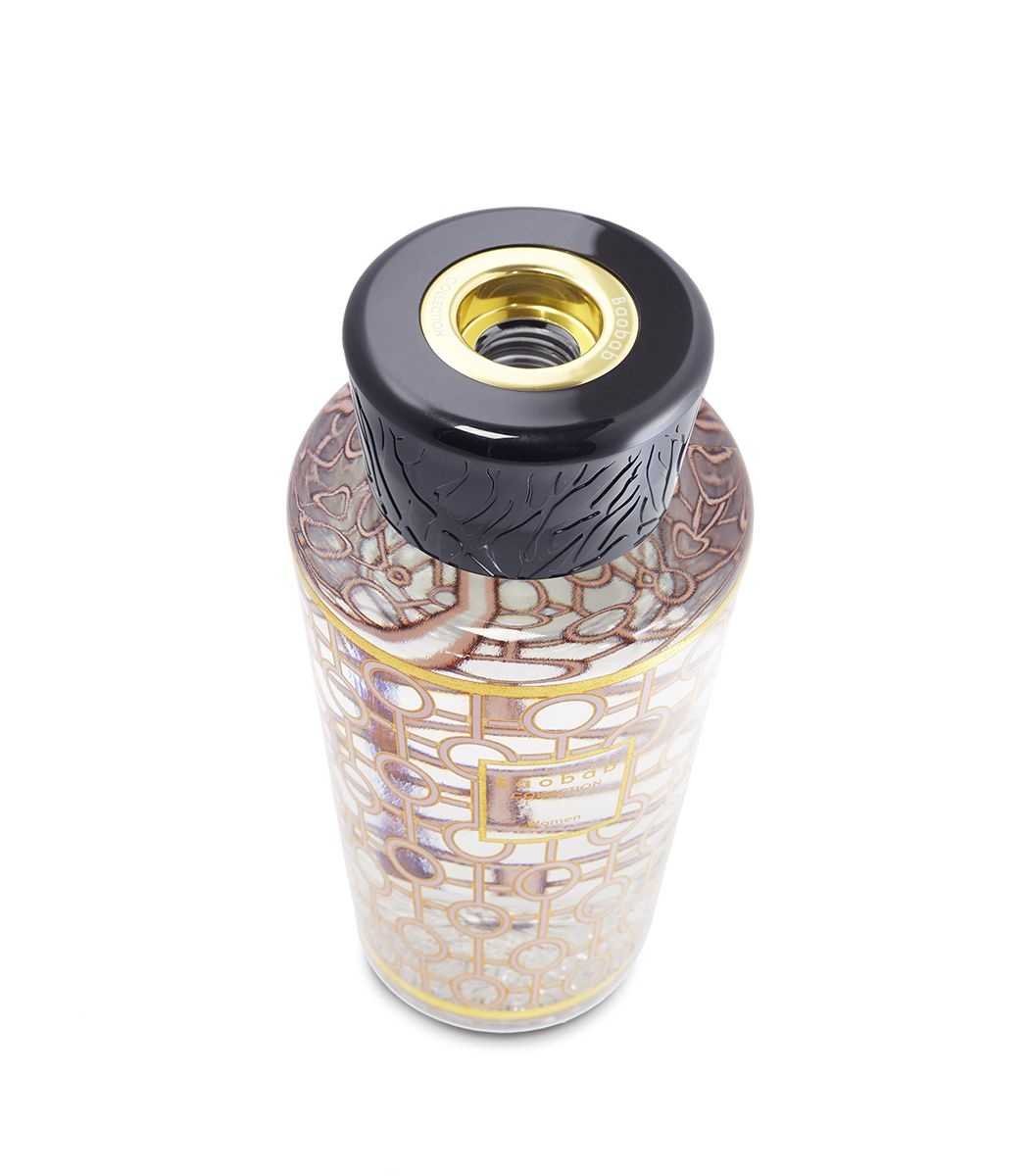 Le diffuseur de parfum d’intérieur Women est décoré d’une élégante sérigraphie d’or 9 carats et de rose poudré dont le motif rappelle le signe de la féminité. Le flacon est terminé d’un bouchon de bakélite noire gravé d’un motif de racines. On aperçoit dans la transparence du verre un dôme au fond du flacon reprenant le même motif et donnant à l’objet beaucoup de sophistication.