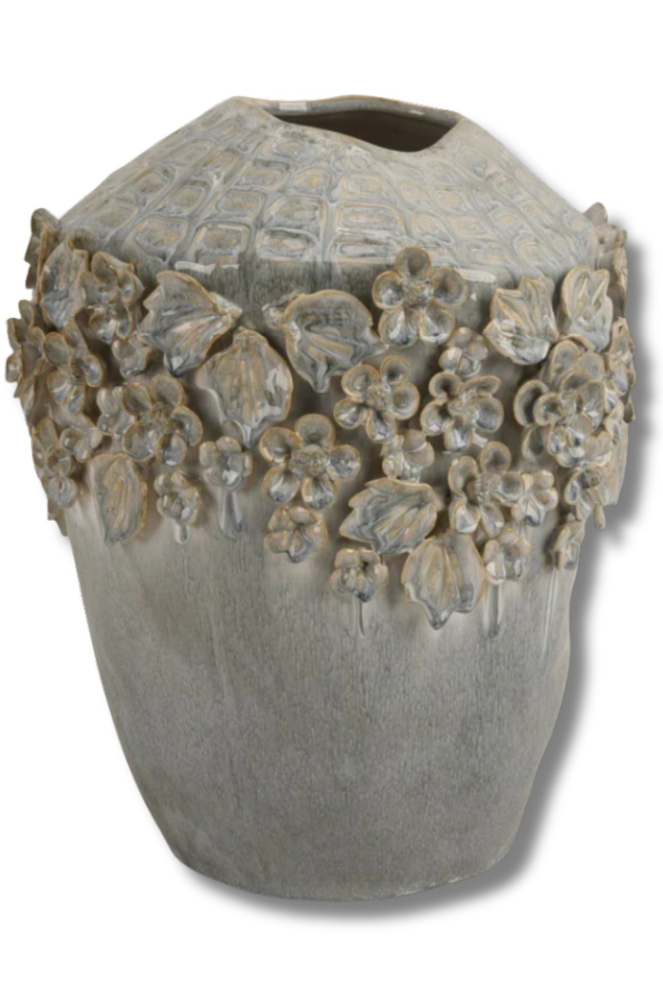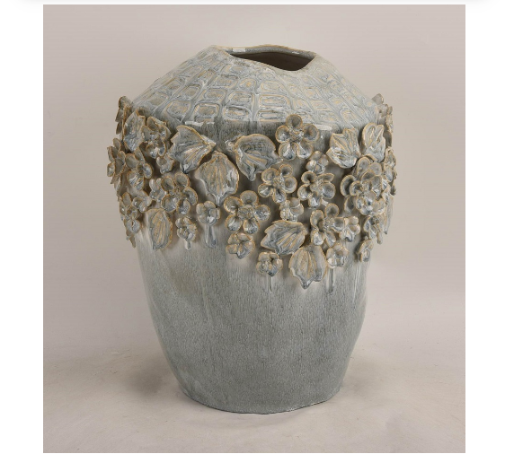 Vase en céramique décoratif avec fleurs en relief, finition bleu gris pâle. Un objet élégant et sculptural pour sublimer une décoration intérieure contemporaine ou classique.