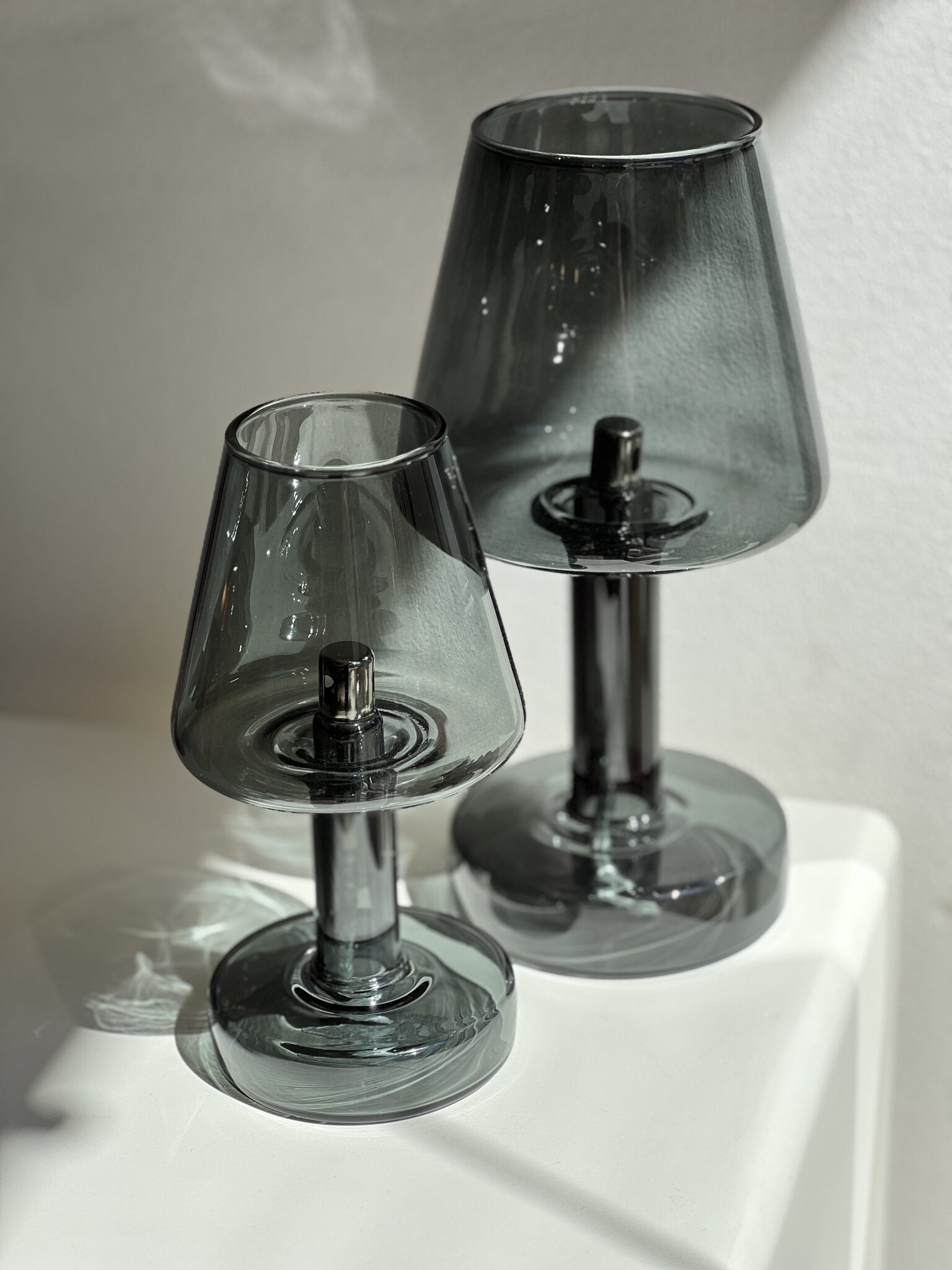 Lampe à huile Dining Smoke en verre soufflé, taille M H.26 cm, idéale pour intérieur et extérieur, flamme protégée, apporte chaleur et élégance à vos tables et ambiances cosy.