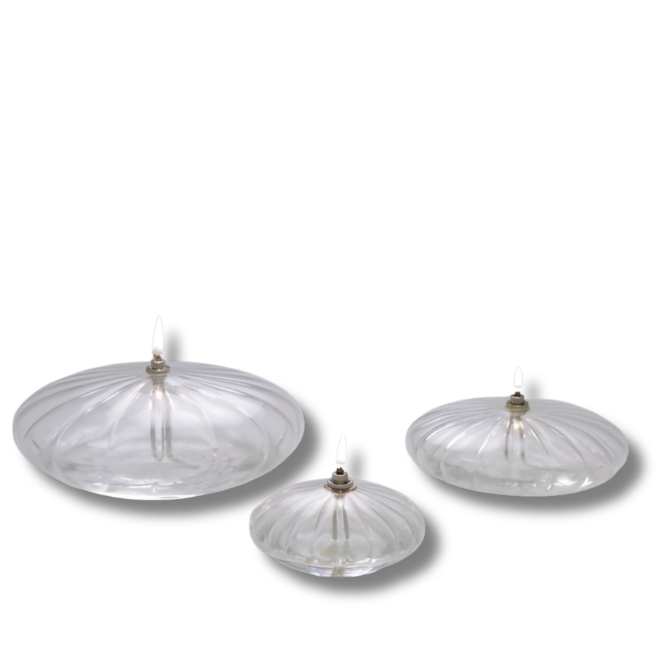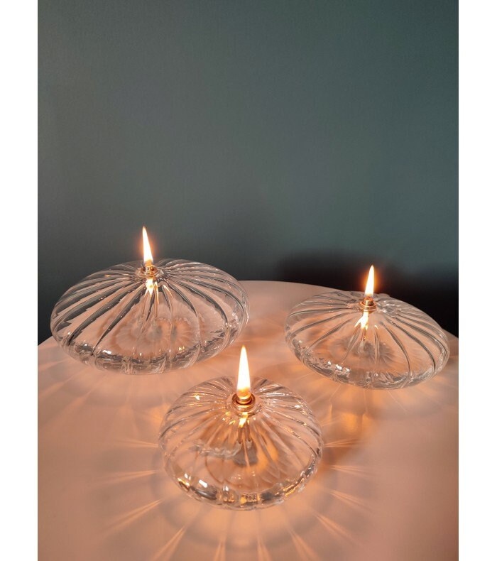 Lampe à huile galet strié en verre soufflé, transparente et élégante, disponible en 3 tailles pour une ambiance cosy et raffinée. Segraeti Monte-Carlo.