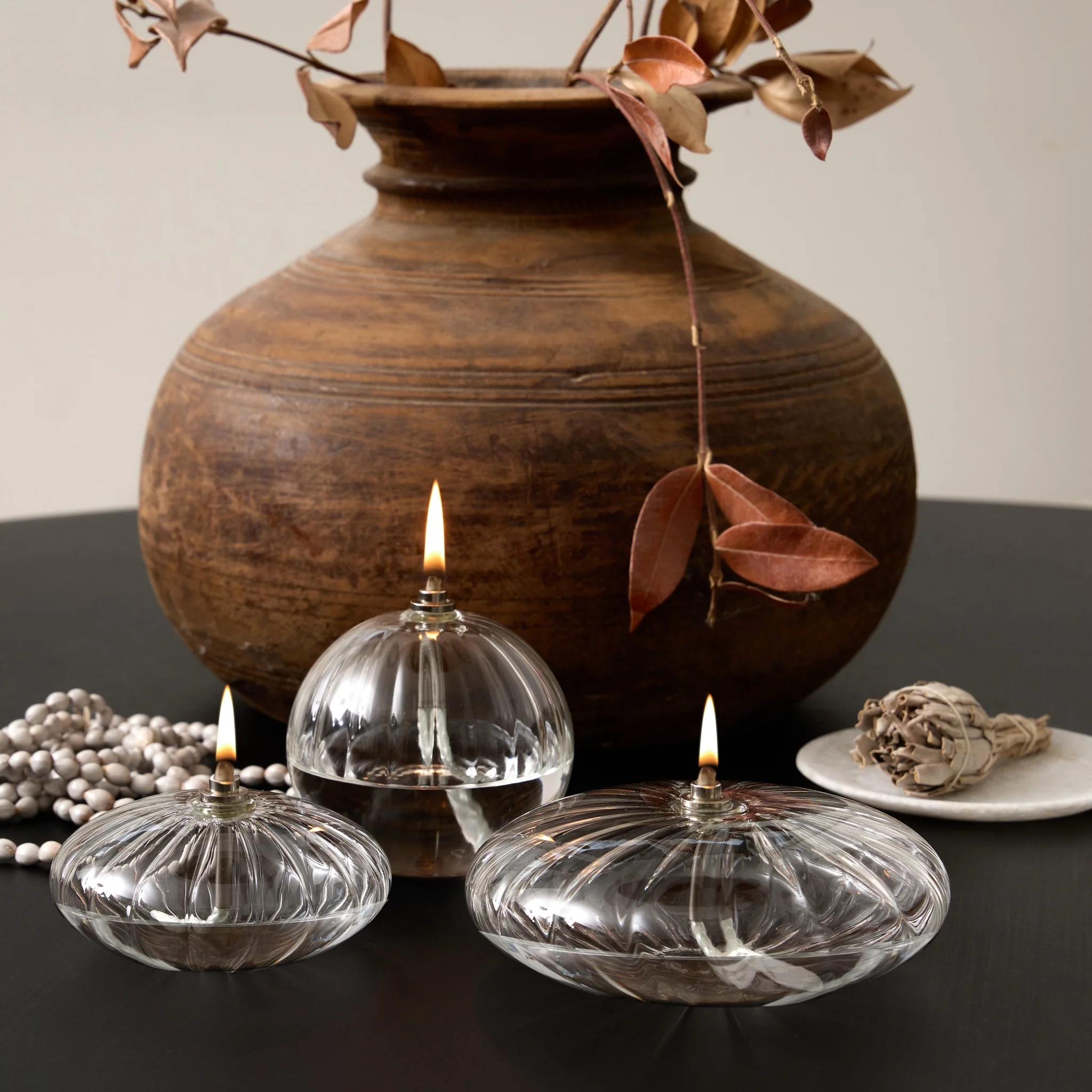 Lampe à huile galet strié en verre soufflé, transparente et élégante, disponible en 3 tailles pour une ambiance cosy et raffinée. Segraeti Monte-Carlo.