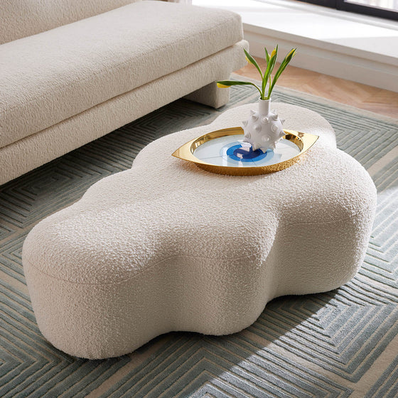 Le Pouf Cloud Ottoman Large de Jonathan Adler revisite une silhouette inspirée des nuages dans une forme sculpturale et contemporaine. Entièrement habillé d’un bouclé Olympus Ivory doux et texturé, il dissimule élégamment ses pieds pour une présence visuelle épurée et aérienne.