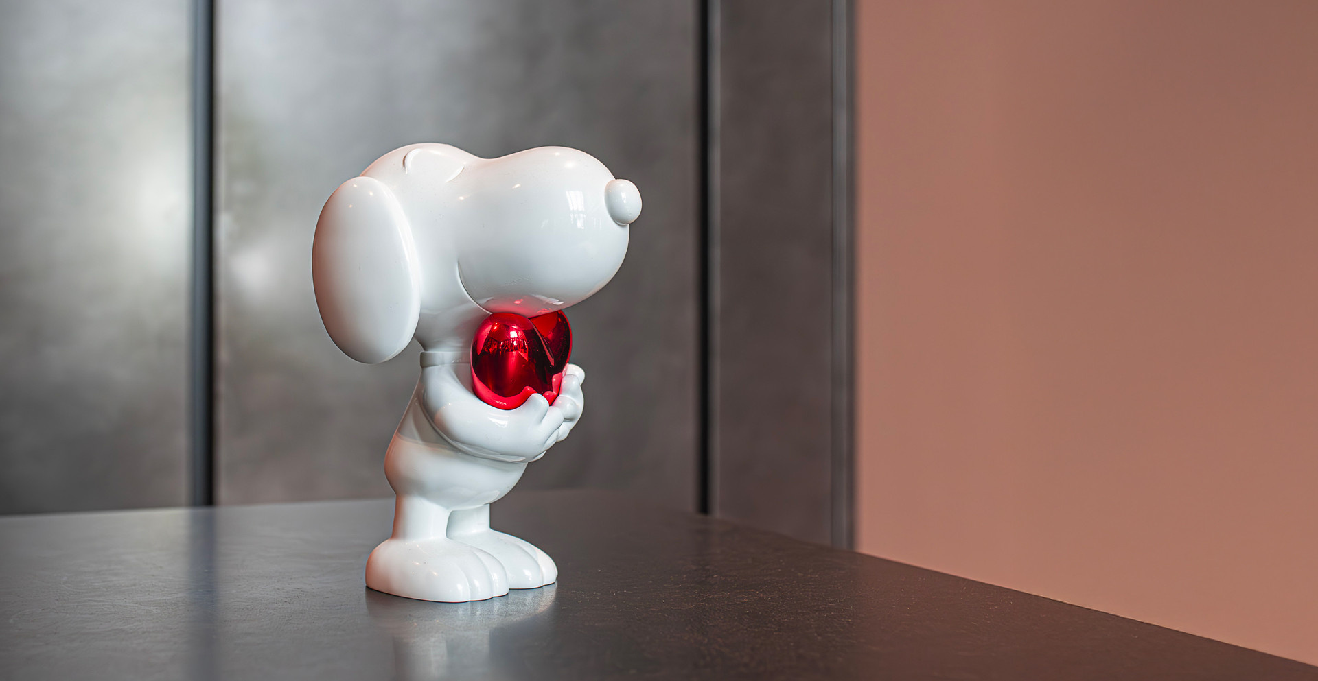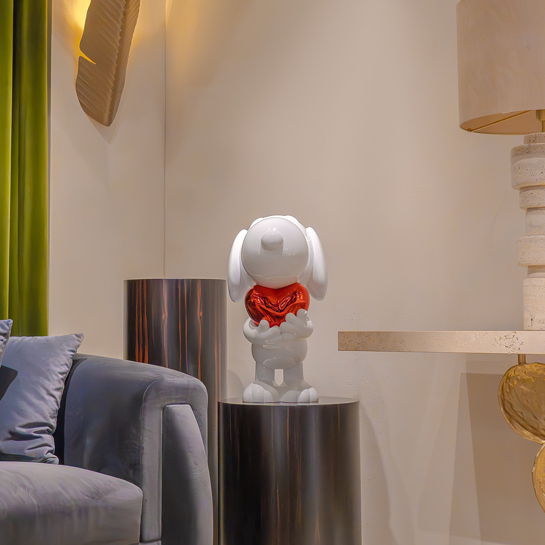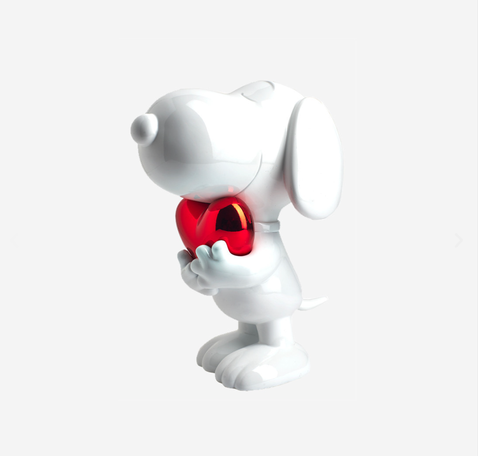 Sculpture Snoopy Cœur Medium en édition limitée à 500 exemplaires. Snoopy en résine laquée blanche tenant un cœur rouge chromé. Fabrication artisanale à la commande en France. Objet décoratif pop art et symbole d’amour.